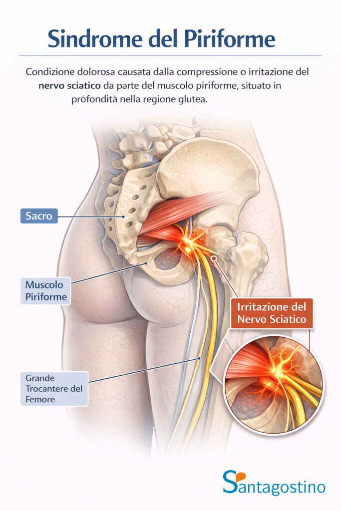 La sindrome del piriforme è una condizione dolorosa causata dalla compressione o irritazione del nervo sciatico da parte del muscolo piriforme, situato in profondità nella regione glutea. Questo muscolo, che parte dalla superficie anteriore del sacro e si inserisce sul grande trocantere del femore, attraversa la zona pelvica proprio dove passa il nervo sciatico, creando un potenziale punto di conflitto.