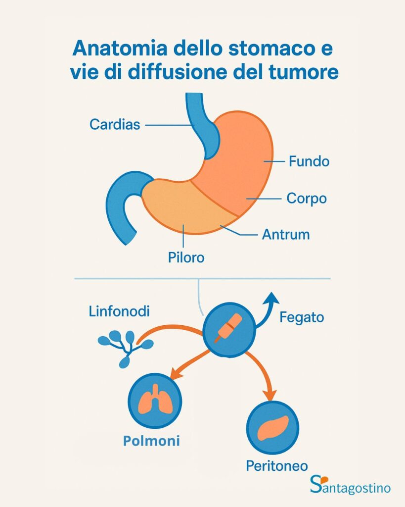 Il tumore può svilupparsi in diverse regioni dello stomaco (cardias, fondo, corpo, antro, piloro) e diffondersi attraverso vie linfatiche, ematogene o peritoneali agli organi adiacenti e distanti.